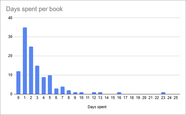 While I strive not to be, I can be pretty inconsistent in my reading pace. More books take 1 day to read than any other length of time, with 72% in 3 days or less and 93% within a week. The longest took a full 23 days (because I was on a vacation where I didn't read much).