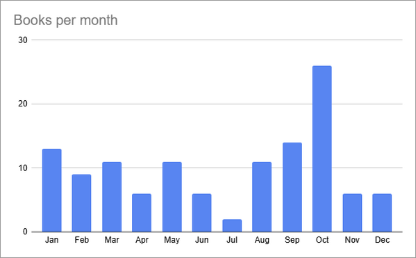 I read much less on vacation than when I'm at home, and I read the most when I get really dug into a series I love - October was 13 books from Mick Herron's Slough House.
